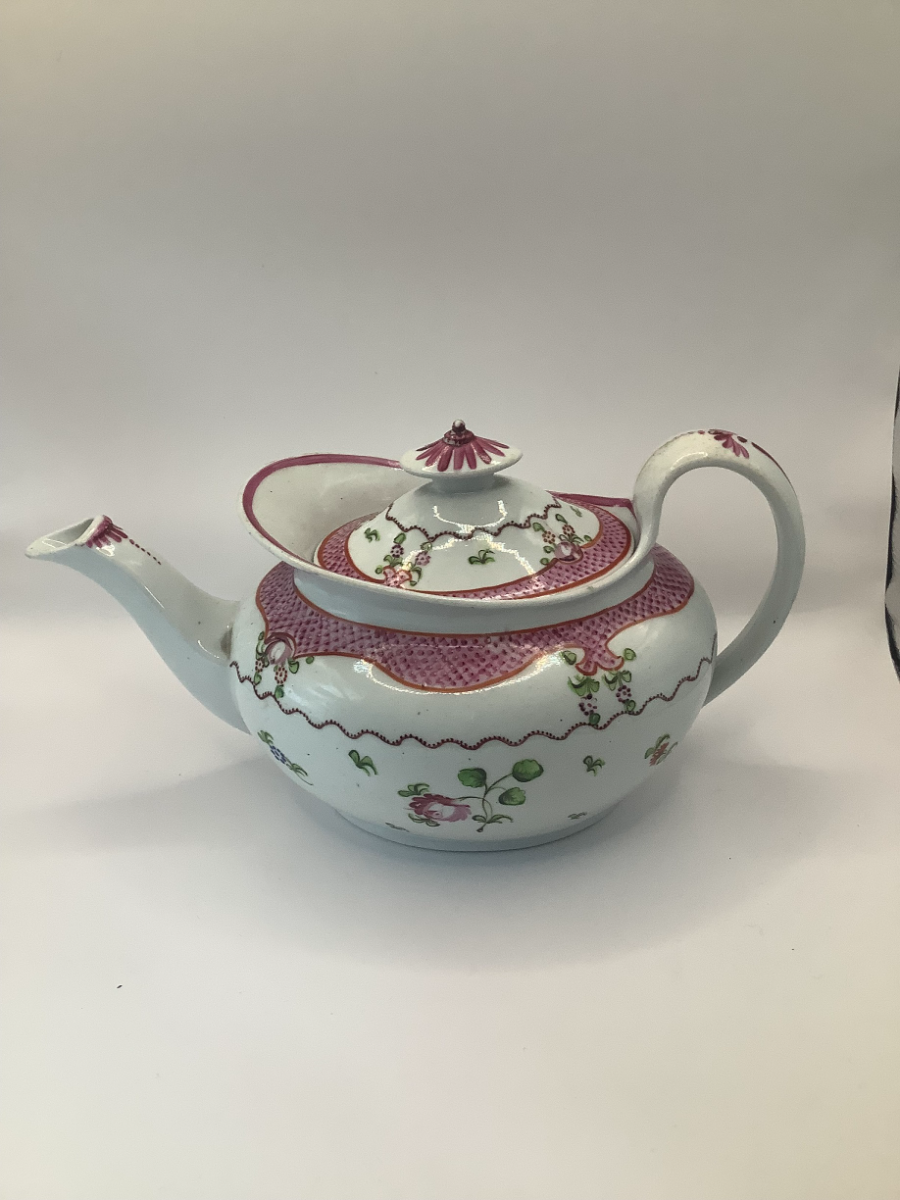 This teapot produced in about 1795 is in pattern 173 with scattered blue, mauve and iron red floral sprigs. The rare boat shaped Teapot has an Internal 9 hole triangular strainer.